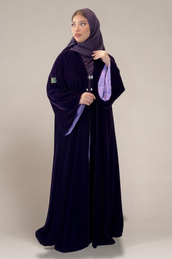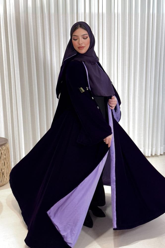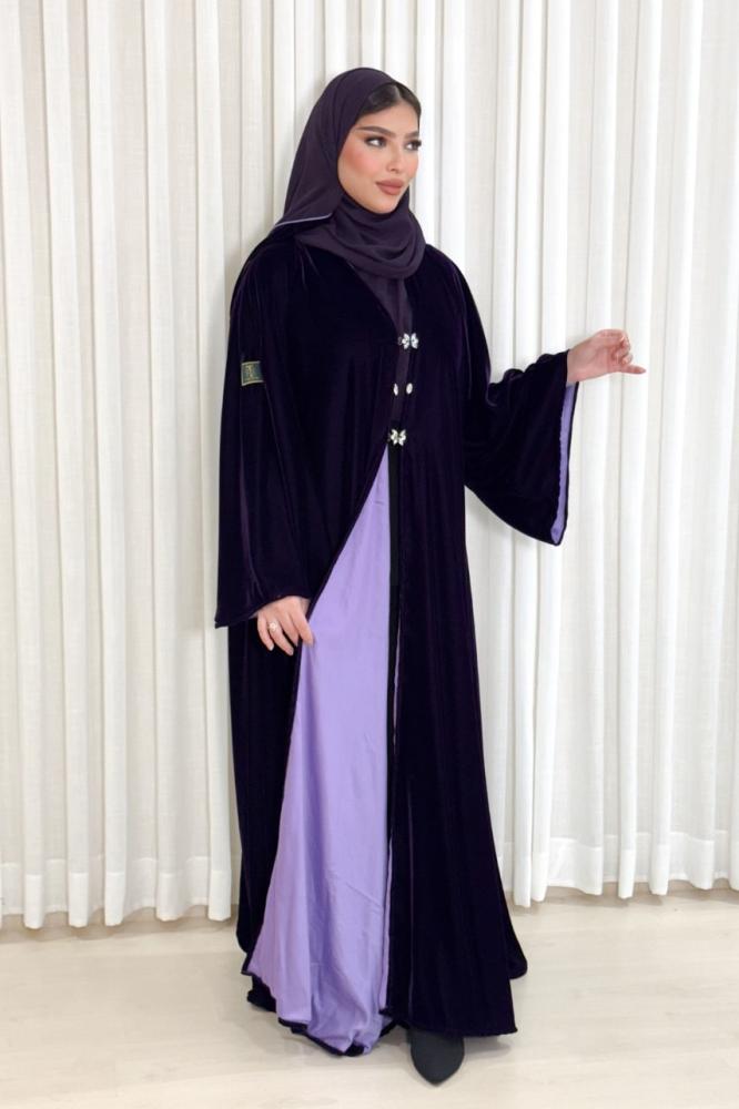 عبايه مخمل كوري بنفسجي اسود مبطمه بقماش قطني بلون اللافندر بقصة كلوش واكمام واسعه.